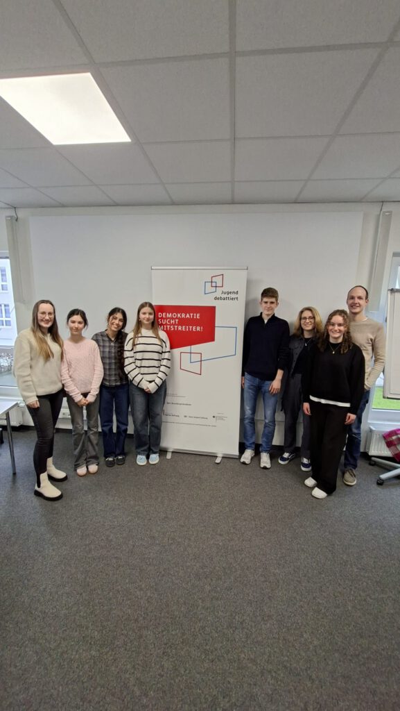 Mit großem Engagement, fachlicher Kompetenz und beeindruckender Bühnenpräsenz stellten sich unsere Teilnehmenden der Konkurrenz aus der Region und haben unsere Schule würdig vertreten. Ein besonderer Erfolg gelang Emma Ortak (Q1): Sie belegte in der Altersklasse II (Streitfrage: „Soll die Veröffentlichung von Wahlumfragen im Vorfeld von Wahlen verboten werden?“) den ersten Platz und qualifizierte sich damit für den Landeswettbewerb. Diese herausragende Leistung ist ein großartiger Erfolg für Emma und unsere gesamte Schulgemeinschaft.
